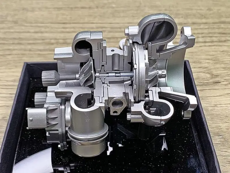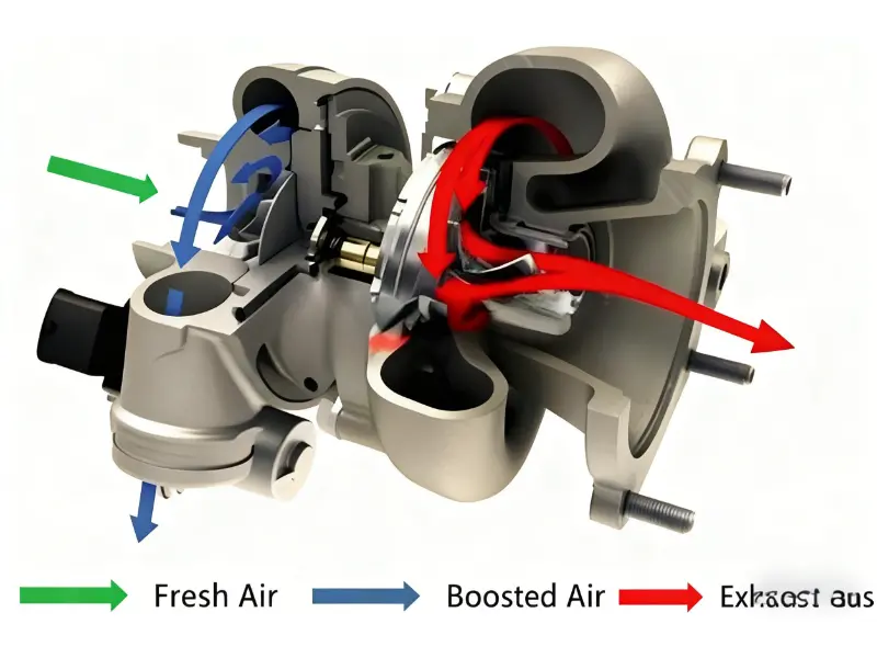 टर्बोचार्जर के दो मुख्य भाग होते हैं: टरबाइन और कंप्रेसर।